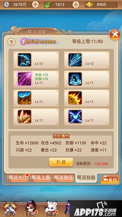 帮贡还可以用来升级我们的帮派技能,包括8个技能,等级上限为80级,技能升级后可提升生命值、攻击、防御、命中、闪避、暴击、抗暴、速度属性。