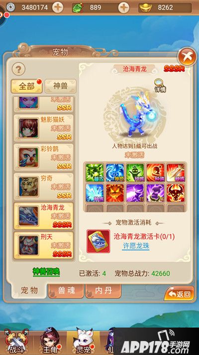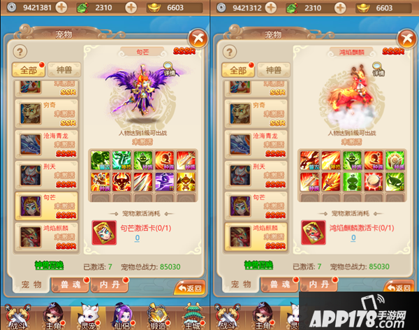 宠物分为R、SR、SSR、SSSR几种品质,首测版本中游戏内已经有30多个宠物,但其中最高品质的SSSR宠物仅有2个,沧海青龙和刑天,相比于其他品质数量明显偏少,因此也有玩家大呼不过瘾。