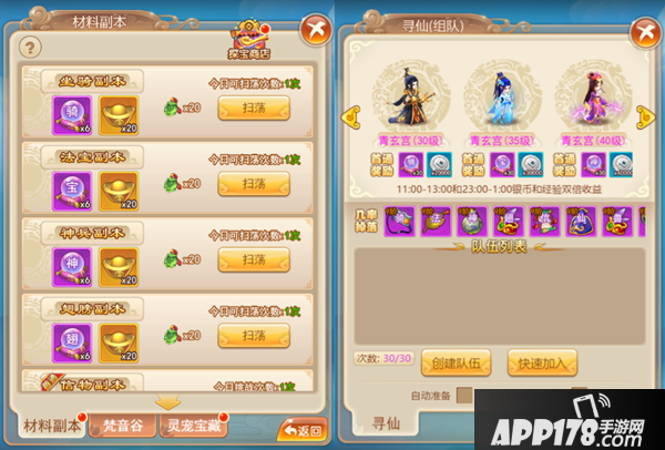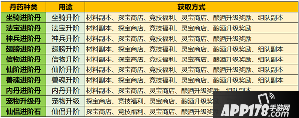 通过整理可以看出,每种丹药材料都对应了一种升阶/升级的养成点,涵盖了坐骑、法宝、神兵、翅膀、信物、仙阶、兽魂、内丹、宠物、仙侣这些的主要养成模块。而各个丹药材料的获取方式其实大相径庭,普遍都产自于材料副本、探宝商店、竞技福利、灵宝商店、酿酒升级奖励、组队副本等,比较特殊的是,宠物升级丹、仙侣进阶石不在材料副本中产出,法宝进阶丹、神兵进阶丹、宠物升级丹、仙侣进阶石不在组队副本中产出,宠物升级丹单独在灵宠宝藏中产出,而仙侣进阶石单独在梵音谷产出,正好说明了灵宠宝藏和梵音谷分别是宠物和仙侣的专属资源产出地。