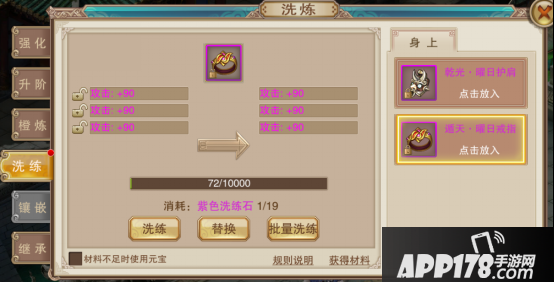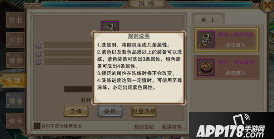 1、只有紫色及紫色品质以上,并且穿戴在身上的装备才能进行洗炼。