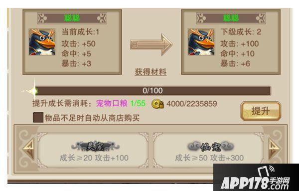 宠物除了宠物等级外,还有成长等级。成长等级需要我们使用宠物口粮才能提升。达到不同的成长等级还可以使宠物进化为灵宠、仙宠等。