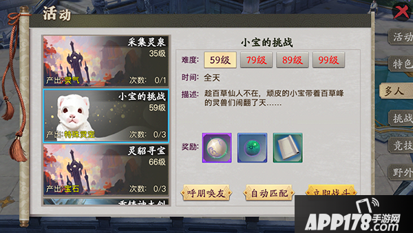 1,多人副本小宝的挑战,分别为59级,69级,79级,89级,99级产出特殊灵宠。