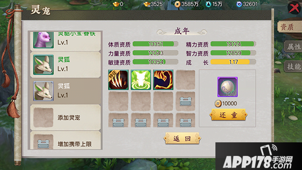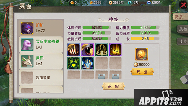2,洗炼成变异宝宝后,用高级还童丹来洗炼灵宠的技能,资质和成长数值。这里洗炼最好洗炼资质和成长数值,技能还有另外的方法可获得,下面会讲到。