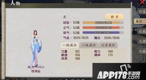 在信息一栏可以看到人物的基本信息(ID、称号、金钱等),属性一栏可以看到分级属性和元素属性。