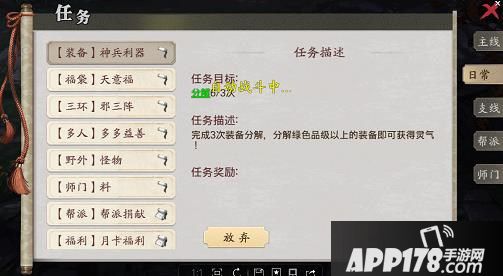 任务菜单需要双击左侧的任务按钮就可以弹出来了。做任务是在初期成长最快的有效途径,跟着主线任务一步一步的深入整个蜀山世界的来龙去脉,通过支线任务了解一些奇怪的传闻,完成日常任务保证每天的成长和活跃,还有帮派任务和师门任务,每一种都很有趣同时也很重要呢!
