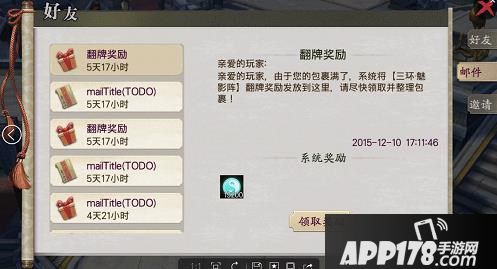 右边第二栏,是邮件功能,它装载着系统发送的种种邮件,其中有包裹满了时未拿的副本奖励,要记得邮件是有时效的哦,错过了时间奖励就无法领取了。