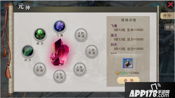 当玩家修炼完某一元神中的所有神魂之后,可使元神进阶,进阶成功后玩家不仅可获得大量属性加成,还可继续修炼更加强力的神魂。