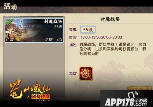 厌倦了单打独斗?封魔战场是团队PVP的不二选择。各位剑仙可在等级达到50级以后,通过活动中的竞技面板报名参加,开放时间是每天13:00--13:30、20:00—20:30两次,每次10分钟。虽然时间不长,但整个战斗过程可谓血脉喷张,瞬息万变。个人战力与装备的差距已经不是左右战局的决定因素,团队配合、战术打法才是考虑的重点。