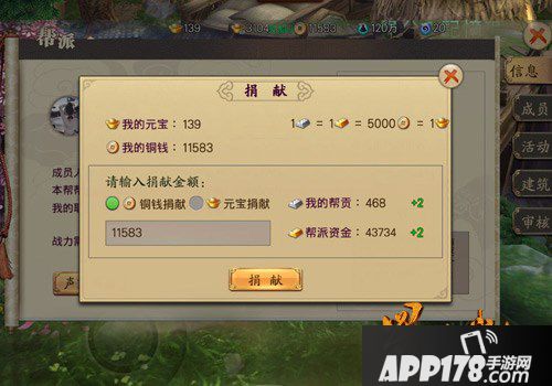 提升帮贡和帮派资产的最直接办法就是捐献,成员通过捐献铜钱和元宝获得,5000铜钱=1元宝=1帮派贡献=1帮派资产。