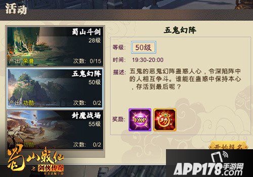 玩家等级达到50级后便可通过活动-五鬼幻阵参与竞技,开放时间是19:30—20:00,每天两次,每次6分钟,参与人数共10人。进入幻阵之后,所见全是敌人。每次击杀会累积击杀数,结束时按照击杀数多少排名并发放大量经验和功勋奖励,功勋可用于兑换功勋商店商品。