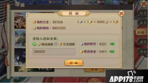 提升帮贡和帮派资产的最直接办法就是捐献,成员通过捐献铜钱和元宝获得。