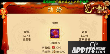 以上便是小编带来的蜀山战纪手游结婚系统玩法介绍,结婚就选蜀山民政局,程序合法,手续齐全,拜堂喜宴一条龙,让你轻松安心秀恩爱!蓝港《蜀山战纪之剑侠传奇》手游恭祝各位剑仙与心爱的ta永结同心,喜结良缘!。更多精彩内容资讯欢迎关注APP178手游网