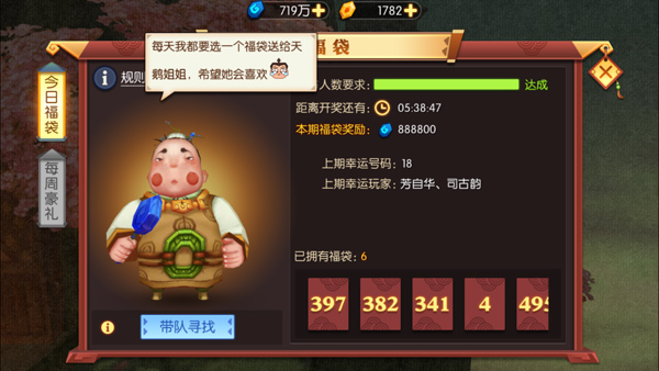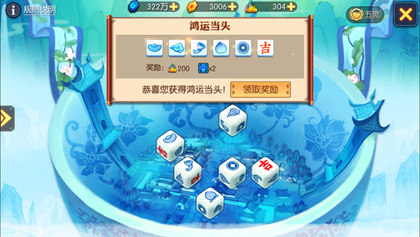 当然,除了紧张刺激的战斗活动,还有一些趣味的休闲玩法。例如每日可在主城寻找福袋小妖,击杀福袋小妖可以获得福袋或者灵石;吉星高照投掷出鸿运当头,将获得大量五灵精华可以培养五灵属性,不过鸿运当头可不是那么容易摇出来的。