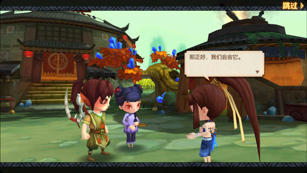 游戏的美术是以3D渲染的Q萌国风,山山水水,一草一木,都刻画得特别细致而给人一种舒适祥和的轻松愉悦感。第一座主城名唤云水村,这名字的灵感大概来源于“云水谣”,主城里如土楼一般的建筑,融合了民族风,更显中国味。而人物角色的雕琢,细腻至毛发与神情的表达,三头身比例的造型更增添了角色的几分Q萌,动作也刻画得非常用心,每一位伙伴进入副本时行走的姿态都各异。民族风情的设计以及Q萌诙谐的角色,的确给这款游戏的第一印象加分不少。