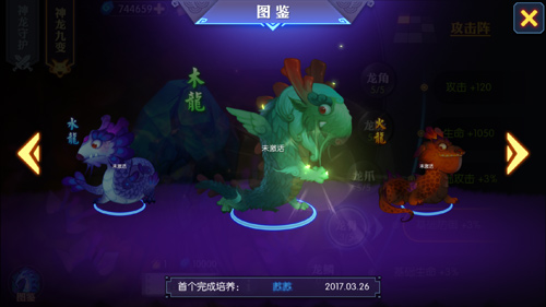 神龙的类型有水龙、木龙、火龙、暗龙、光龙,对应伙伴类型。首只培养的神龙便是水龙,培养完成方可激活,继续下一类型神龙的培养。另外,首个完成培养的玩家将被展现在图鉴中,获得无上荣光。每次神龙的培养需要消耗龙魂石与灵石,龙魂石的主要获取途径是召魂。每一次培养可相应增加攻击、生命、防御等属性。