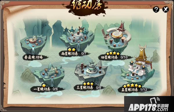 练功房共分为6个房间,分别为:普通练功房、一星练功房、两星练功房、三星练功房、四星练功房、五星练功房