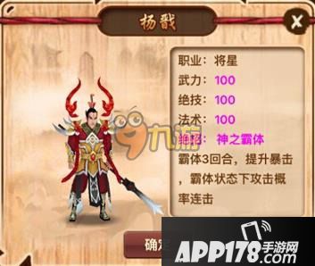 绝技神之霸体,霸体3回合,提升暴击,霸体状态攻击概率连击。记得页游神仙道时候看到对方的杨戬都非常害怕,终于手游中可以免费抽到。最主要的是将星职业,不仅有很高的防御,还能够增加暴击和连击概率,不害怕是不行了。
