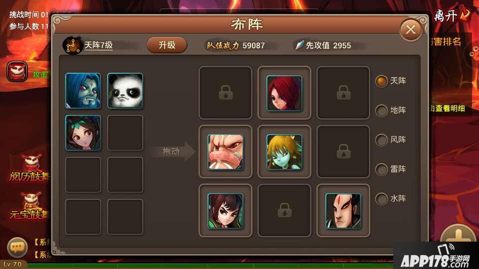 世界boss,分别分为两种赤炎兽和擎天木两种,中午十二点打赤炎兽,晚上八点打擎天木。小编不得不承认只是换了个名字而已。每天鼓舞500阅历一次(必满)。每天bosd只可以打一次,参加了十二点的就不可以参加晚上的了。boss等级应该和全区参加人数和全区等级有关。至于小编为什么这么说,因为内测时人少小编的五十多级了boss才刚五十,而现在小编所在的一区小编五十的时候boss已经70了。恩,想必boss的基本玩法大家都知道了。下面为大家说一下打boss的布阵情况。
