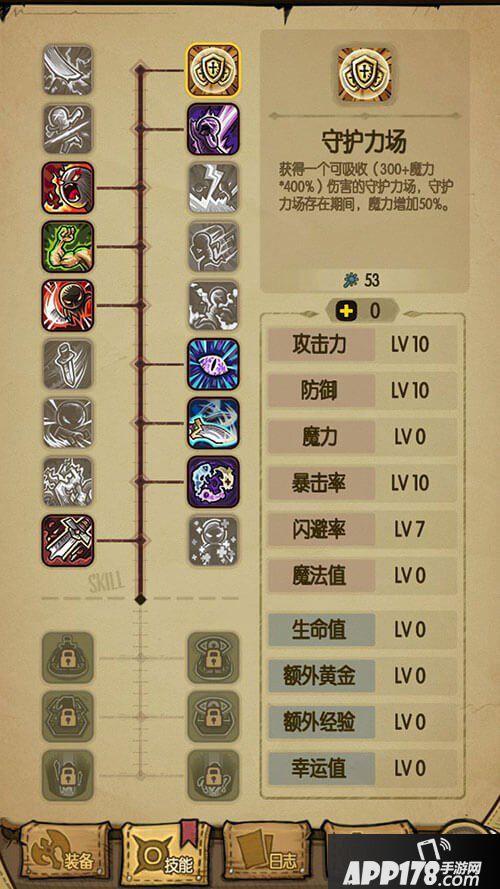 “守护力场”,获得一个可吸收(300+魔力*400%)伤害的守护力场,守护力场存在期间,魔力增加50%。10000魔力值时,可吸收的伤害为40300。守护力场存在期间,魔力值增加到15000,此时的治疗术回复为52500,魔法吸取输出魔法伤害为18750,能量爆裂造成魔法伤害值为37500。