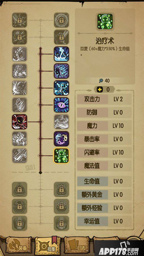 “治疗术”,回复(60+魔力*350%)生命值。10000魔力时,回复血量为35060。消耗40点魔法值施放一个“治疗术”,人物立即满血。