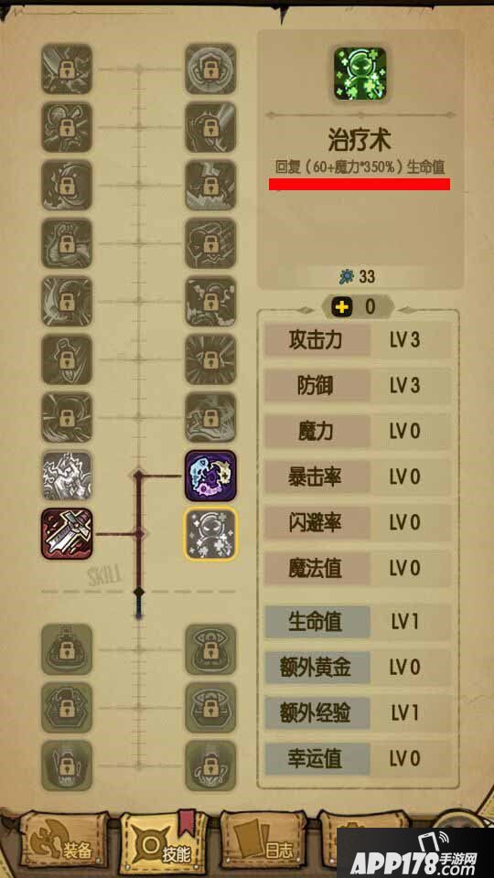 但是,一味地在生命和防御上加点,自然造成攻击力等其他方面较为平庸。不过从初期保命这个角度出发,这又是最可行的方式。当玩家连续加点6次,此时将出现首个技能选择分支。其中一个技能【治疗术】效果为单一的手动恢复生命值,另一个技能【虹吸斩】效果为攻击并附带为自己回复等同攻击伤害的生命值。