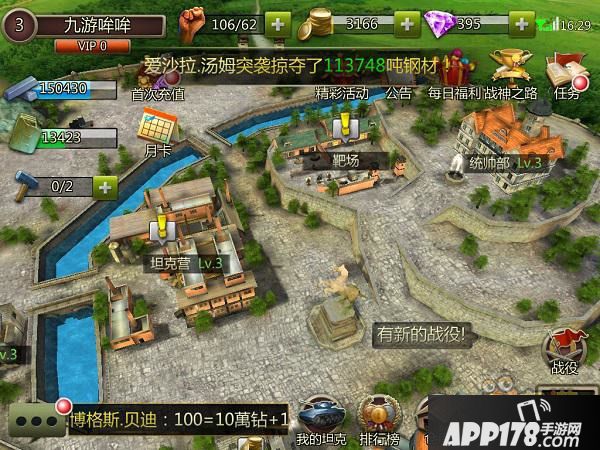 《坦克指挥官》的主界面是玩家的军事基地,在基地里,玩家可以发展自己的基础建筑,基本的资源、研究所、坦克修理等等,对建筑物进行升级产生更多的资源,是一个经典的模拟建筑玩法。