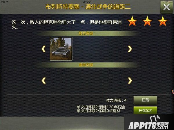 PS:在第一章节之中每次战役只能用出战一台坦克,只有通过第一章才会解锁第二个出战栏位,通过第四章解锁第三个出战栏位,通过第六章解锁第四个出战栏位。