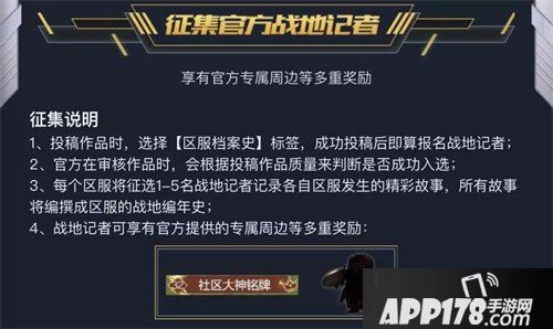 每一个人的心中都有自己的红警故事。如果你愿意做读者,请用心来听。如果你愿意做记者,请用心来写。只要在投稿作品时,选择【区服档案史】标签,成功投稿后即算报名战地记者。战地记者不仅可以成为自己所在区服历史的撰写者之一,还能获得官方提供的专属周边等多重奖励。