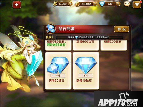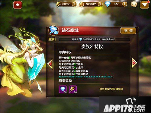 看来游戏还是比较良心的,就算玩家们没有充值,也享有贵族1的特权。作为基本特权,玩家们可以获得一些基础的福利,例如购买体力,购买金币,购买技能点数等等。但是如果玩家们想要获得更好的福利,就需要充值了。以贵族2为例,玩家们需要充值60钻石,贵族2的特权会比贵族1的特权好很多,而且还可以领取贵族2专属礼包。