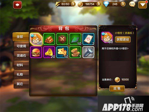 进入背包系统后,我们可以看到背包系统分为:可使用、灵魂石、材料、礼物、其他五大类。玩家们可以在对应的类别中找到自己想要的物品,如果玩家们的背包满了,或者有不想要的物品,也可以通过背包直接出售。点击想要出售的物品,右侧就有它的详细用途以及出售价格。