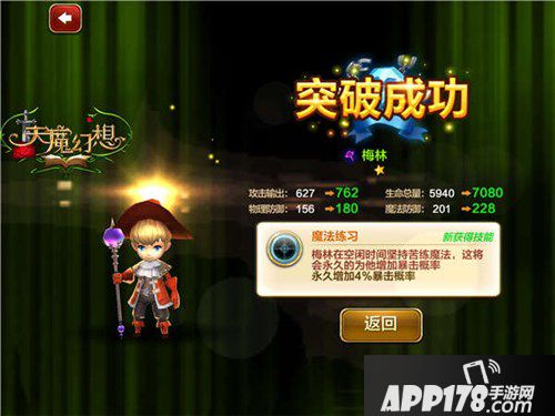 3.伙伴突破。《天魔幻想》的各种印记可直接增加战斗力,并且可增加的战力值直接展示。突破需要搜集定向高级印记,随着装备颜色的更迭,伙伴的战斗力也随之获得巨大提升!伙伴突破还可获得属性的提升与新技能的解锁!