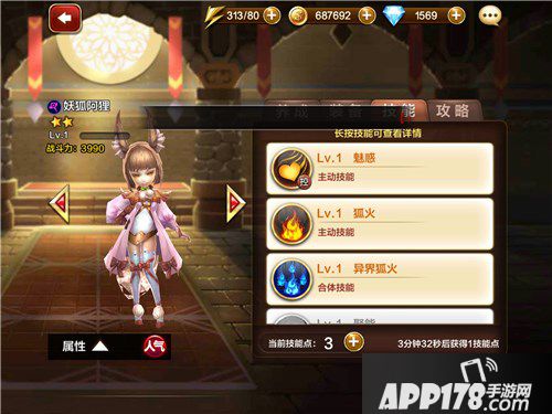 点评:妖狐阿狸是一名魔法攻击型角色,拥有较强的魔法攻击输出,技能1可以魅惑敌人,降低其魔防并眩晕,同时对单体敌人造成成吨的伤害,主动技能和合体技能的输出能达其他群攻角色的两倍,是游戏中正宗的暴力输出角色,值得玩家培养。