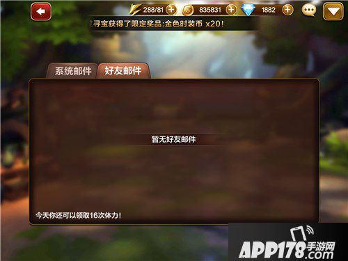 2.好友邮箱:玩家只需点击邮箱中的好友邮箱就能领取好友赠送的体力。同时,在好友系统中玩家也能赠送好友体力,每天领取好友体力有上限,如果上限数量没达到,就在游戏中多添加一些游戏玩家吧!