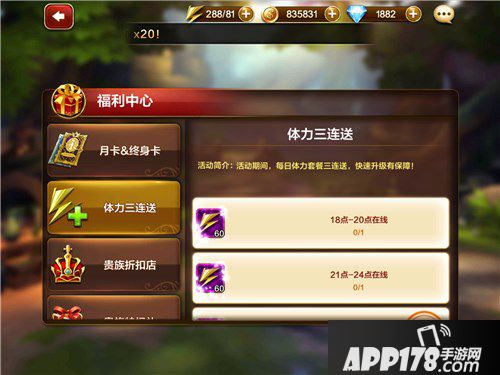 1.福利中心:体力三连送,在活动期间,每天体力套餐三连送。时间分别是:21点-24点在线、12点-14点在线、18点-20点在线。