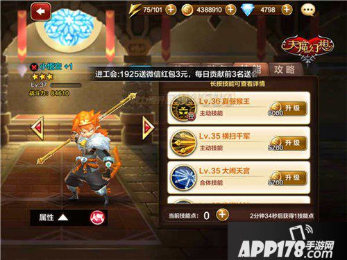 5、升级技能。不要以为加点技能只是让技能更强力而已哦!升级技能也是可以增加战力的!所以,对于那些你主力培养的伙伴,不妨多多研究他的加点分配,同时,定时上线将“当前技能点”分配干净,防止技能点溢出。