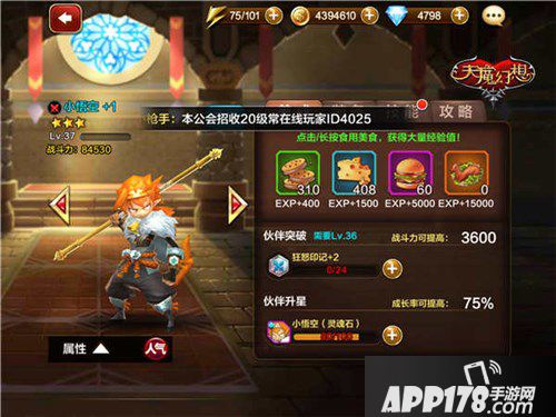1、伙伴升级。每一位伙伴都会在不断成长中获得战力的提高。伙伴升级可以通过携带伙伴上阵或者食用美食,来获得大量经验值,从而实现伙伴等级的提升。要注意的是,伙伴等级上限为游戏帐号上限,所以想要让伙伴快速成长,首先就要通过挑战或扫荡“冒险副本”、尽可能多地完成“每日任务”、加入公会每日换购“玩家经验X1000”等途径来实现。