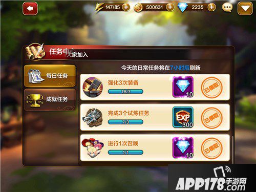 强化3次装备:收集角色装备对应材料,并进行三次升级,每次可不同角色,总数共三次即可完成,可获钻石。