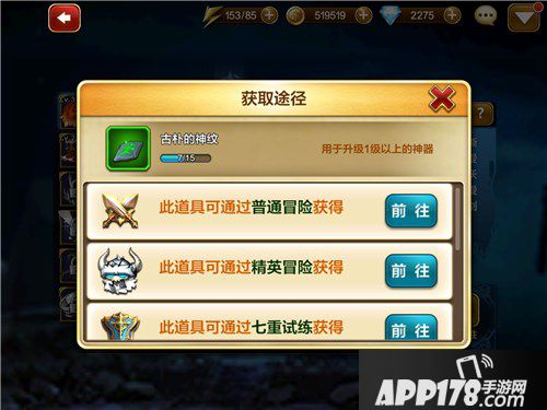 每款神器一共有5种道具升级,一个神器从1级以上到5级以上,再到10级以上以此类推分别开启一种升级道具。每种道具都产出于:普通冒险、精英冒险、七重试炼这三个地方。随着神器等级越高,产出的升级道具就越少,特别是第一个升级道具古朴的神纹,每一次升级都会用到,玩家平时一定要记得累积。