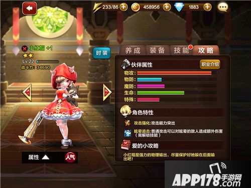 小红帽:一名远程物理攻击型伙伴,攻击能力非常突出,以及合体后的控制技能。只能对血量低于50%的敌人产生眩晕效果,这就意味着这个技能只有在战斗的后半程,才能发挥最强大的作用。小红帽的灵魂石产出途径也非常的多,适合培养。