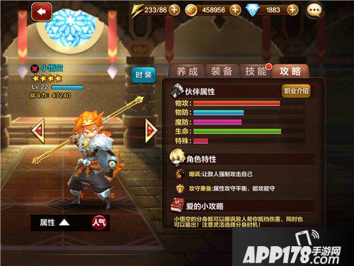 小悟空:一名近战物理攻击型伙伴,对于普通玩家来说是一位非常实用的角色,真假猴王”可以嘲讽敌人,在开局阶段保护自己的后排输出免遭毁灭性的打击。同时在前排可当半个肉盾实用,有输出能抗打,在一些规定不能使用魔法攻击型小伙伴的关卡中,有他就相当于拥有了一个魔法输出哟。每天领取开服奖励,6星猴子指日可待。