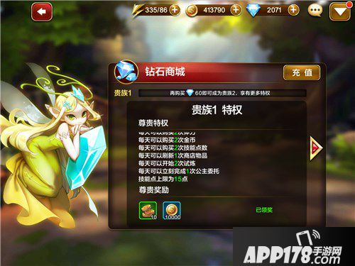 领取开服奖励,正如奖励下方所述,坚持领取32天只升6星小悟空。玩家如果想要第一天就快速的升级,还有一种好的办法就是直接购买VIP,累积消费0元享受贵族1待遇,累积充值6元享受贵族2待遇,可重置副本,购买三次体力等待遇,以此类推。充值越多,享受的特权就越多,升级就越快。