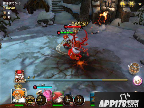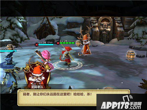 玩家进入游戏后,会小奔跑一小段,进入战斗后,圣诞老人作为大BOSS,技能多样。圣诞老人是一位近战英雄,会开战的第一时间释放一个主动技能,玩家需要躲过第一个技能,就能减免许多伤害,接下来就是小悟空的前排和圣诞老人近战肉搏。玩家要注意后排的站位,圣诞老人带有群伤技能,后排两位角色必须分散站开,或三个伙伴成一个三角形。还要注意圣诞老人的礼物,初期我也以为是可以吃的道具,结果是个炸弹。被华丽的外表所迷惑了。遇见圣诞礼物包装的东西,一定的躲的远远的,输出的伤害很高哟!