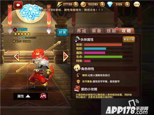 小悟空的定位属于纯粹的团队半T,分身很有意思,要玩悟空,第一个技能是一定要先点满了,很好用。第二个技能带打断效果,打BOSS专属,不过不是控制,只是打断,CD短可以及时打断,作为免费赠送的英雄,不得不说企鹅这次良心了,比1元首冲的范海辛好多了。