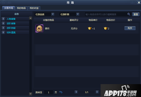 2、交易市场包括人物装备、进阶装备、进阶技能和道具材料四大类。