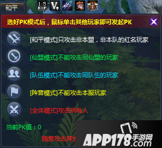 和平模式:只能攻击非本盟、非本队的红名玩家。