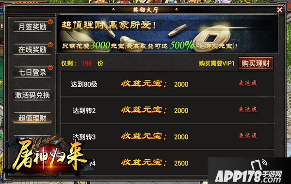 5.超值理财:你不理财,财不理你,你若理财,5倍收益,只需花费3000元宝购买超值理财,即可获得5倍元宝返还哦!特别提醒:购买理财需要先成为vip1哦!