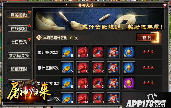 《屠神归来》福利多多,良心至上,玩家每天都可领取大量免费奖励,在主界面点击‘奖励大厅’即可进入奖励领取界面!
