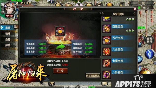 然后推荐大家提升神炉里面的宝石等级,宝石可以大幅度地提高人物的攻击力,宝石碎片可以通过打BOSS掉落和每日副本,也可以从一些活动里面获得,比如每日的充值活动,还有VIP的等级奖励,宝石副本有条件一定要领取双倍奖励,其次的就是魂珠了,魂珠主要提高人物的暴击率和暴击伤害,是PK的时候想爽快地秒人的首选属性,魂珠主要获得途径跟宝石差不多,都是参加活动或者商城购买,剩余的护盾跟血符因为无法直接使用元宝购买的,所以先不急着提升,护盾的话每天通过材料副本沉默神庙(有条件一定要领取双倍奖励)就可以获得比较多的了,血符可以通过平时的挂机打怪慢慢累积。
