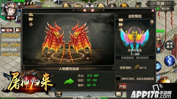 接下来推荐提升的是翅膀了,提升翅膀可以大量增加人物的攻击力和防御力,而且可以获得酷炫的造型,还是比较值得的,提升翅膀所需的羽毛可以通过参与活动奖励获得或者商城购买,还可以通过天空之城副本(有条件一定要领取双倍奖励),提升VIP等级可以获得大量羽毛奖励。