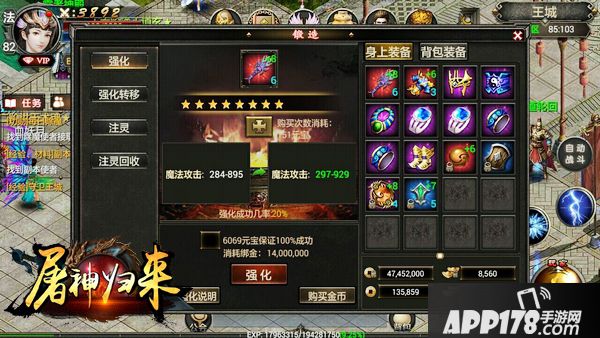 最后推荐的是装备的强化,以及BOSS积分以及功勋称号。之所以摆到最后才讲是因为这些前期都不用急着去升的,第一因为装备弄得再好,有可能被人杀了就爆掉了,这样一来基本就前功尽弃了。至于BOSS积分,可以通过平时打BOSS和在线的时候累积增加,或者可以101级之后花费人物经验来兑换,直接元宝购买的话,因为属性提升不是很多性价比不算太高所以不推荐;功勋称号也是如此,可以通过每日的功勋除魔,不用怎么花费元宝就可以获得不少的功勋,所以这两样不用急着去升,如果你是大R超R不缺钱的话就不用考虑这些了,直接买买买,点点点就是了。